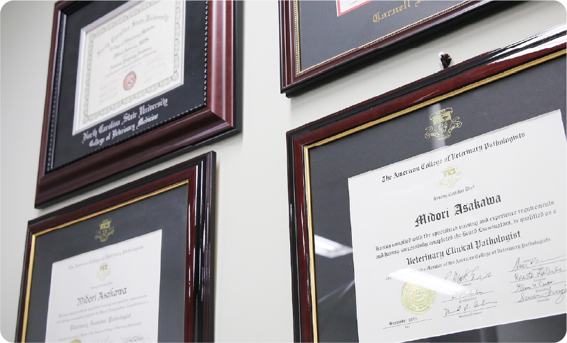 病理科は、動物から採取された組織や細胞を病理医が顕微鏡下で診断を行っています。当院は、細胞診診断と病理組織診断の2つの米国専門医資格を有する病理診断医が常勤しています。院内において剖検を行うこともあり、研究への貢献も行っています。