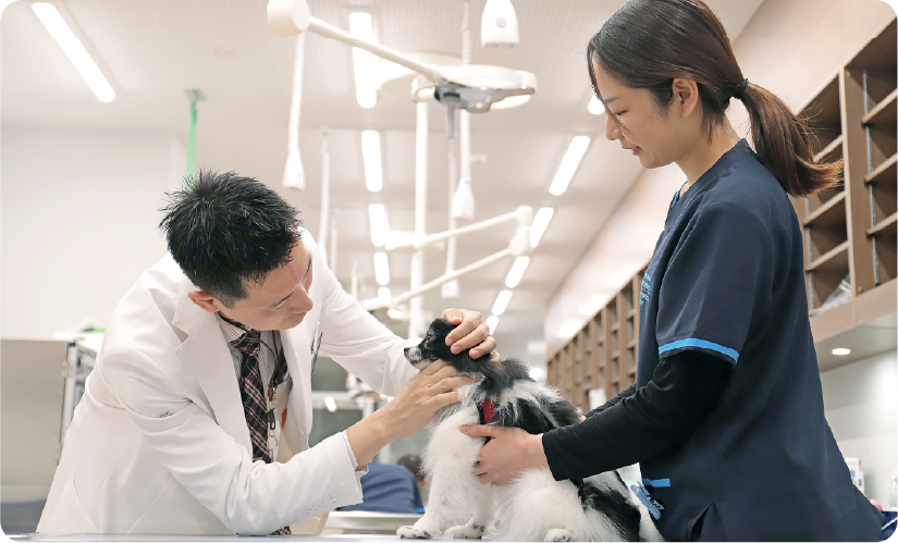 当院では、動物の医療の質や安全性の向上、高度化に伴うニーズに対応するため、専門診療、救急治療、診断部門の様々なスタッフが連携して治療に当たるチーム医療を目標としています。