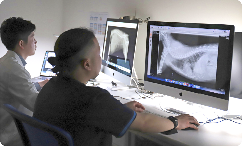 当院では、一般的な病院では実施が難しい胸腔内、腹腔内の軟部組織手術やTPLOを含めた様々な整形外科手術を実施しています。軟部外科症例では、画像診断科や臨床病理科と協力し、また整形外科疾患では、ひとつひとつの症例に丁寧に身体検査を実施し、的確な診断を下します。